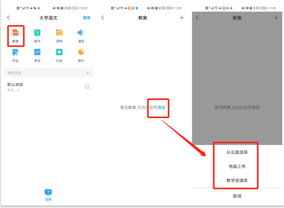 1:点击【教案】,点击蓝色字体添加或者右上角【+】添加教案(注:这两种方式添加的教案需是PPT格式)
