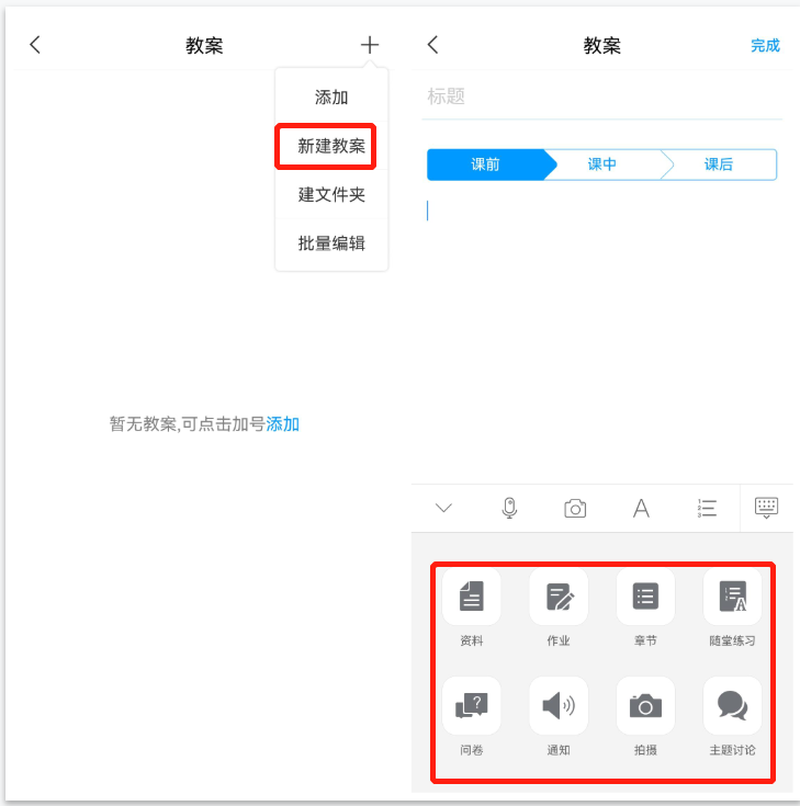 2:若需添加其他格式的教案,则点击右上角【+】,选择新建教案,然后点击左下角的加号可选择多种形式的资料或者活动上传。