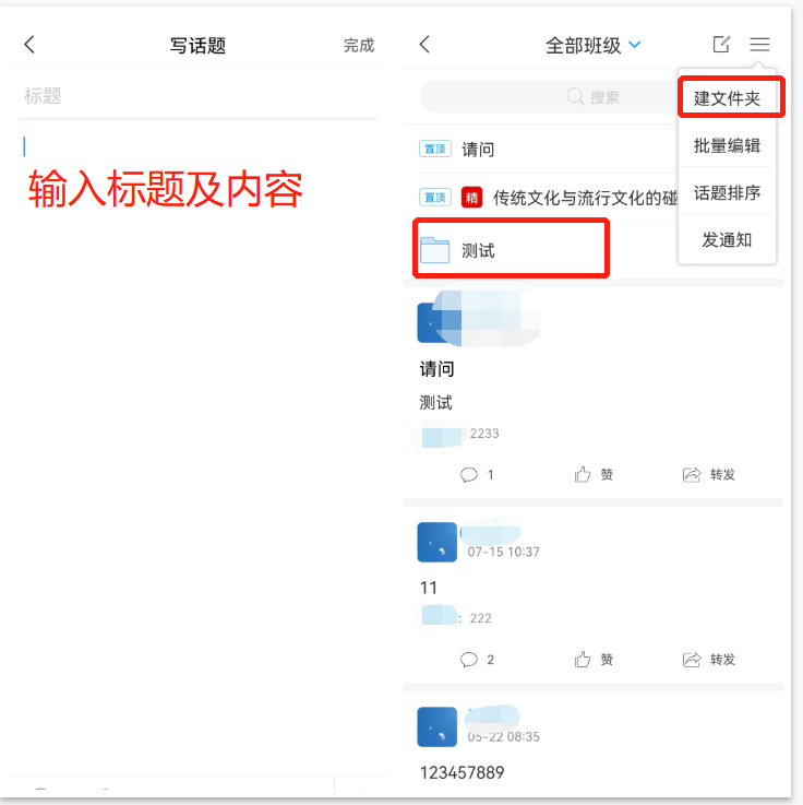 点击【讨论】,点击右上角,输入标题及内容即可发布讨论,长按某条讨论可进行该评论的置顶,加精,复制或者删除等。选择右上角三个横线处的【建文件夹】则可建立新文件夹,在文件夹里发布讨论,进行一个分类的作用。
