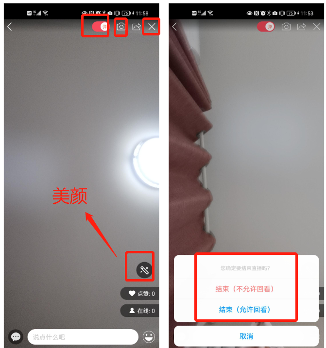 开启直播后,直播可支持【美颜】功能,支持【开闭弹幕】、【摄像头转换】、【转发分享】此次直播。观看直播可在下方输入文字或者发送表情与直播者互动。结束此次直播,点击右上角【x】并可设置【是否允许回看】。