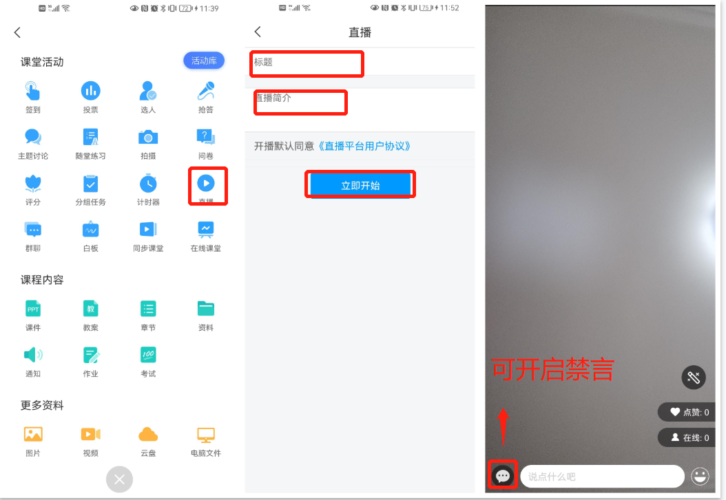 选择任一个要发布课堂活动的班级,点击“+(活动)”按钮,点击【+】,选择【直播】。教师可在任何地方发起直播,学生可在线观看。