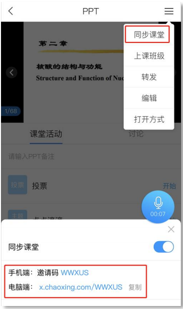 教师在直播上课页面右上角点 图标,再点击同步课堂,出现手机端邀请码和电脑端链接,教师可以通过班级群聊或微信群分享该课堂邀请码和链接