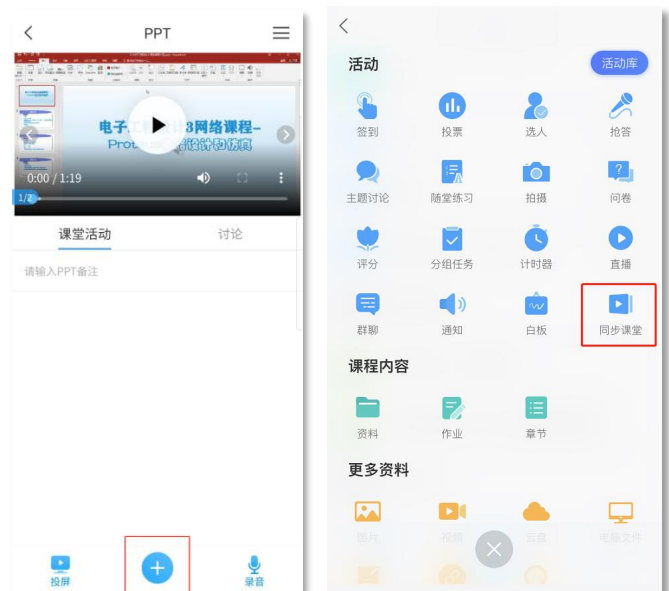 在教案栏目打开导入的 PPT,点击页面下方的加号按钮,在活动页面点击同步课堂按钮,再选择班级,确定后开始课程直播