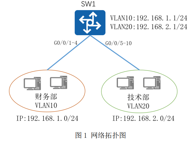 VLAN20 分别用于财务部、技术部的计算机接入,VLAN10 使用 192.168.1.0/24 网段,VLAN20