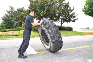 双脚站稳,下蹲,身体前倾,靠在轮胎上,双手抓住轮胎,核心肌肉保持紧张,抬起轮胎。