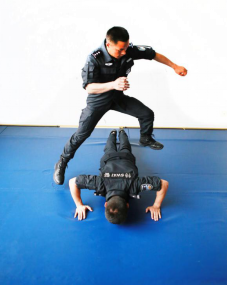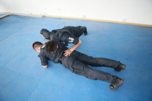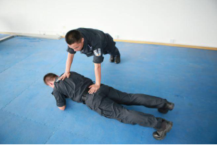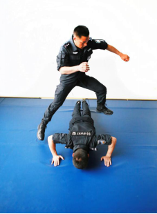 两名学员搭档,一名学员做俯卧撑,另一名学员利用对方做俯卧撑下降的时候跳越对方,当对方撑起的时候,再从身体的下方快速匍匐穿过,反复进行20次左右。
