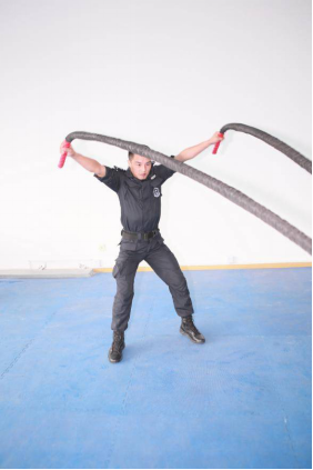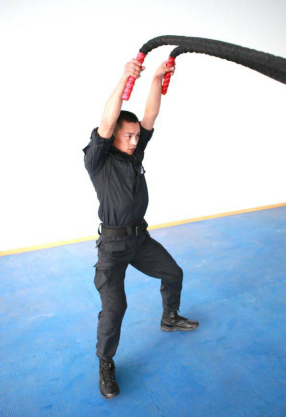 甩绳训练是核心稳定和爆发力训练的一种较好的方式,通常绳长为15米左右,直径在4厘米。