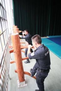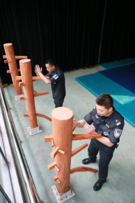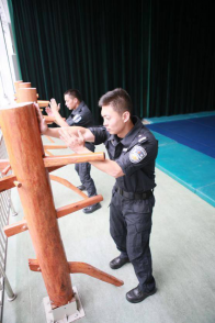 另外,可以通过木人桩做对打训练(图3-23),在一定程度上降低学员的痛阀,使学员的手脚变得更加坚韧有力,得到整体锻炼效果。