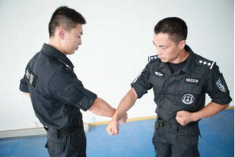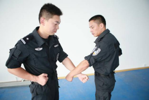 两名学员各自双手握拳,将拳置于两侧腰间,同时面对面站立保持一臂距离。双方同时使用交叉手由内向外甩臂,利用自身的腰力带动手臂撞击对方的手臂,撞击的位置是各自手臂拳背所在一侧靠近手腕的部分,如此左右手反复交替练习(如图3-19)。
