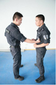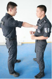 两名学员各自双手握拳,将拳置于两侧腰间,同时面对面站立保持一臂距离。其中一方出拳击打对方的胸部、腹部,肋部等部位(如图3-20),另一方抗击。