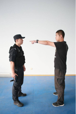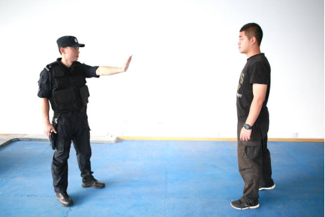 执法过程中安全保障实质上是来源于对距离的控制,安全距离的控制能使警察获得更多的反应时间,能使嫌疑人不能轻易地攻击到警察的身体。与嫌疑人之间的距离控制也是确保安全的重要因素,距离嫌疑人既不能太近也不可太远,要根据警察执法的任务来决定。任何情况下保持与对方的安全距离是最基本的,基本的安全距离是嫌疑人不能直接接触到警察,也就是说嫌疑人要攻击警察必须要有位移才行。徒手戒备动作实战运用的首要目的是对安全距离的控制,在与嫌疑人保持安全距离的基础上,犯罪嫌疑人想攻击警察,就必须要先移动,警察就有足够的反应时间做出徒手戒备动作进行防护,同时向左、向右或向后迅速移动来保持与嫌疑人之间的安全距离,同时大声的警告嫌疑人不要靠进。在这一过程中,警察要注意移动的距离和位置是根据嫌疑人的反应情况及地形所决定的,如嫌疑人情绪激动,警察通过评估判断可能发生激烈的肢体冲突时,则与嫌疑人之间的距离要大,同时移动的速度要快,为自己争取更多的反应时间,为进一步采取行动做好充分的准备。位置的考虑则是根据现场地形而决定的,如当警察背后有一堵墙,当嫌疑人攻击警察时,警察再向后退则退无可退,这样就失去了安全距离,嫌疑人会对警察的人身构成威胁。