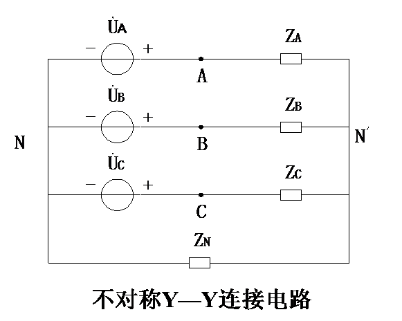 在三相电路中,只要电源、负载有一部分不对称,此电路称为不对称三相电路。如图: