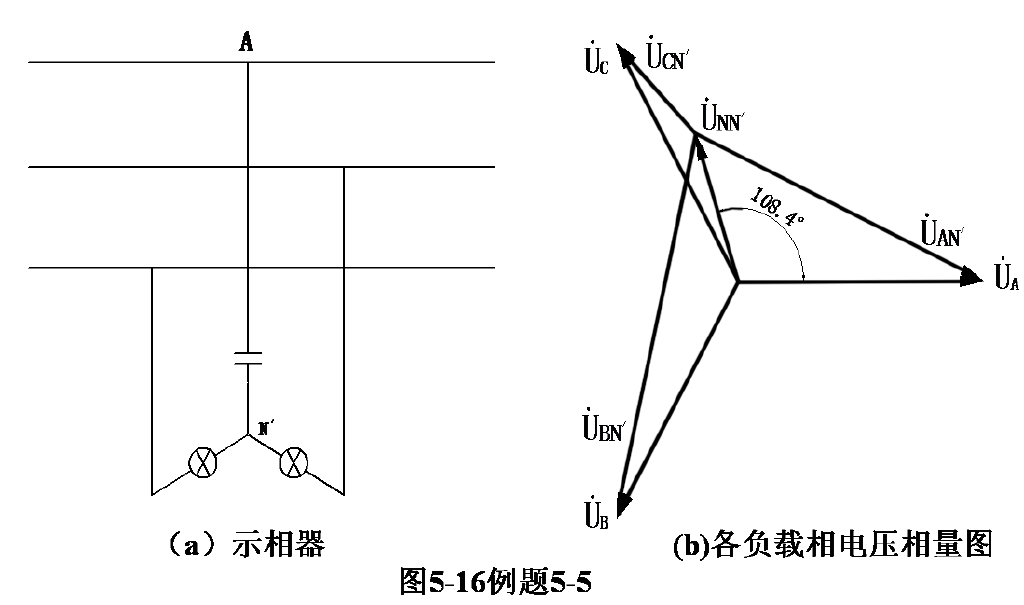 作相量图如图5-16(b)可以看到B相负载的电压比C相负载的电压大,则较亮的白炽灯是B相。