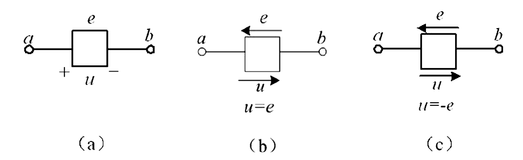 若选择电动势和电压的参考方向相反时,如图1-6(b)所示;若选择电动势的参考方向和电压的参考方向一致时,如图1-6(c)所示。