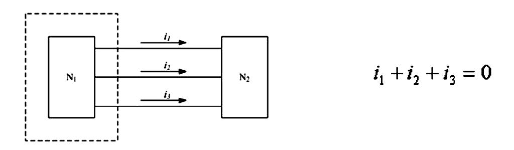 基尔霍夫电流定律,可以推广应用于电路中的任一假设的封闭面:通过电路中任一封闭面的电流的代数和为零。