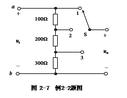 图2-7是一个固定的三档分压器。当改变开关S的位置时,就可改变输出电压uo的大小。设输入电压ui=12V,试求S分别置于1、2、3时的输出电压uo的值。