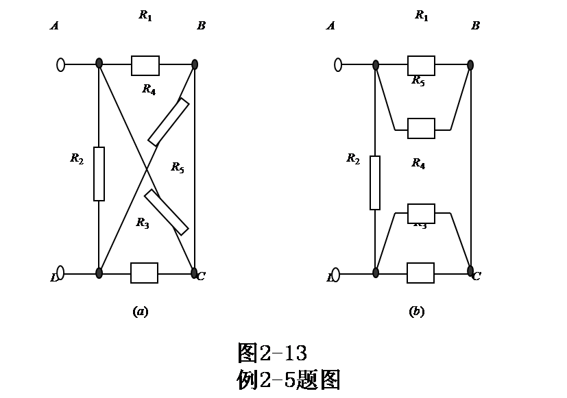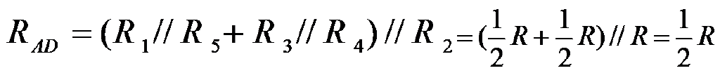 在图2-13(a)中,R1=R2 =R3 =R4=R5 =R,试求A,D间的等效电阻RAD。