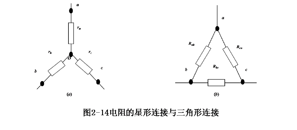 在图2-14 (a)中,三个电阻元件Ra、Rb、Rc的一端O连在一起,另一端分别连接到电路的三个节点,这种连接方式叫做星形连接,也叫Y连接。在图2-14(b)中,三个电阻元件Rab、Rbc、Rca首尾相连,接成一个三角形,这种连接方式叫做三角形连接,也叫△连接。