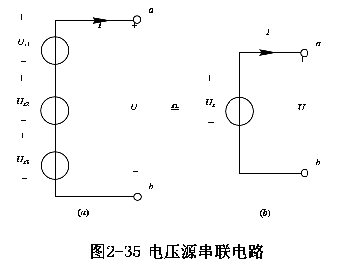 多个电压源串联时,其等效电压源的电压等于各个电压源电压的代数和。