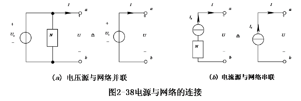 ② 和电流源串联的元件(或网络)对外电路而言不起作用,可看作短路。