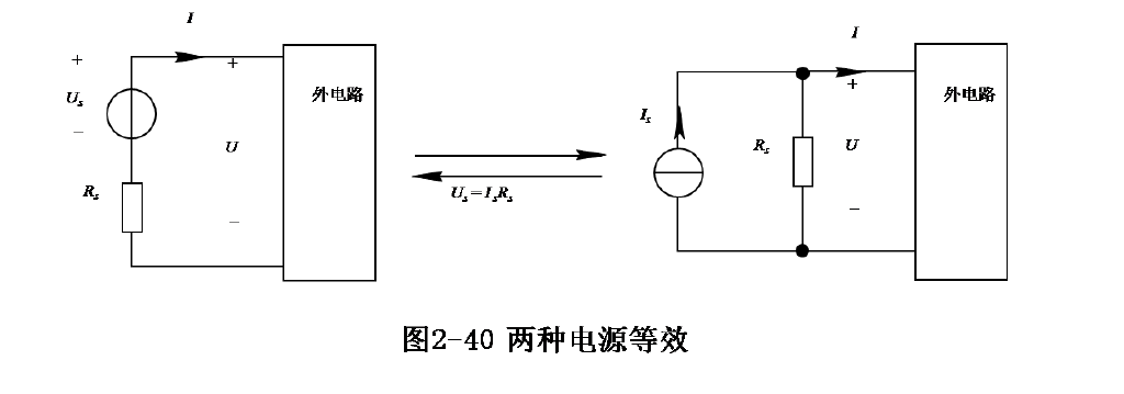 ③ 电源互换等效的方法可以推广运用,如果理想电压源与外接电阻串联,可把外接电阻看作内阻,即可转换为电流源形式。如果理想电流源与外接电阻并联,可把外接电阻看作内阻,转换为电压源形式。