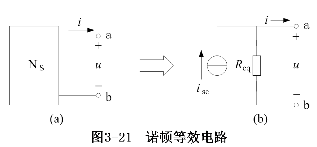 诺顿定理指出,含有独立电源的线性二端电阻网络,对其外部而言,总可以用一个电流源和一个电阻的并联组合等效替换,这个电流源的电流等于该网络的短路电流,而电阻等于该网络内所有独立源不作用时网络的等效电阻,这个电流源与电阻的并联组合称为诺顿等效电路。