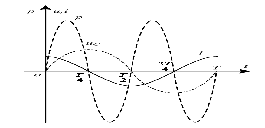 电容元件的瞬时功率是一个2倍于电压(或电流)频率的正弦量,如图(4-16)所示,既有吸引储能(充电);又有释放储能(放电)。且一周期内吸引的储能和释放的储能相等。
