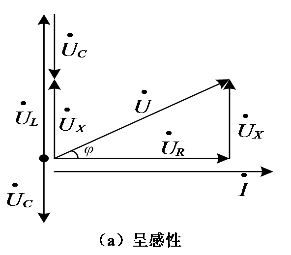 时,则  , 电路呈感性,电路的电压超前电流,其相量图如图所示。