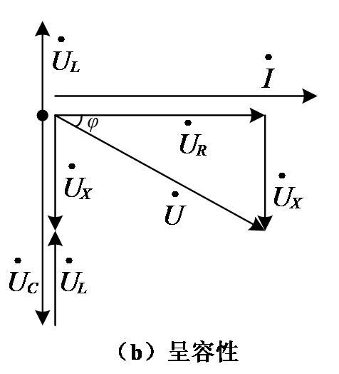 当时,则,电路呈容性,电路的电压滞后电流,其相量图如所示。