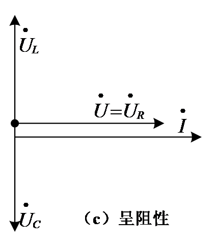 时,则,电路呈阻性,电路的电压和电流同相,其相量图如图所示。此时的状态也称为谐振。