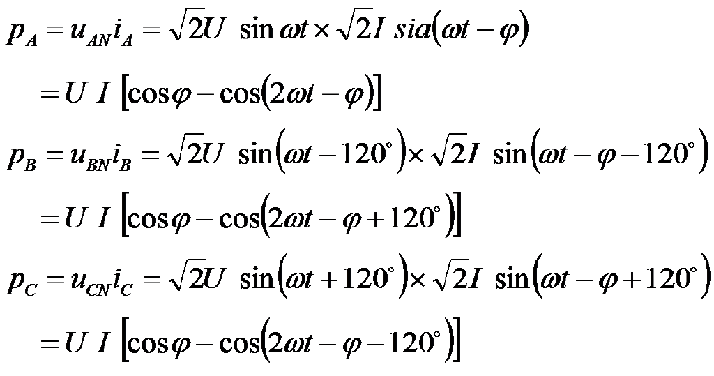 三相电源或三相负载的瞬时功率等于各相瞬时功率之和,在对称三相电路中,设