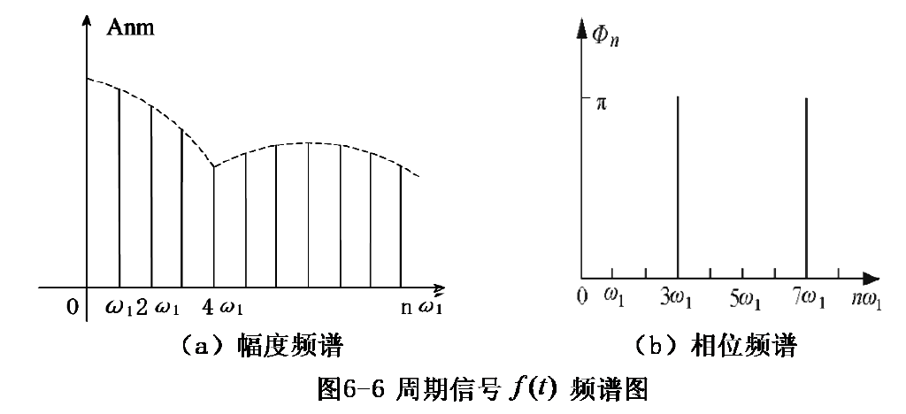 显然,频谱图可以非常直观地反映出非正弦周期信号所包含的谐波分量以及各次谐波分量所占的“比重”。如果把幅度频谱的顶端用虚线连接起来,则该虚线就称为幅度频谱的包络线。