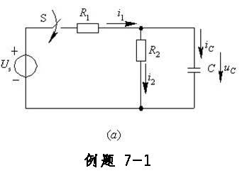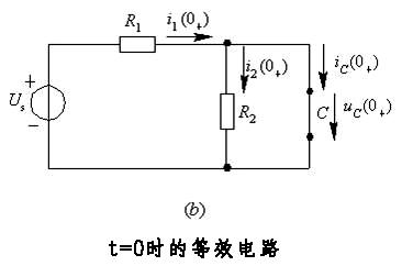 (3) 求其它各电流、电压的初始值。画出 t=0+时刻的等效电路, 如图7-1(b)所示。由于uc(0+)=0 , 所以在等效电路中电容相当于短路。故有