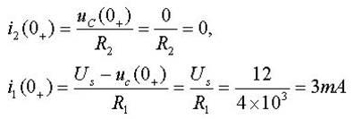 如图7-1(a)所示电路中, 已知Us=12V,R1=4kΩ,R2=8kΩ,C=1μF, 开关S原来处于断开状态, 电容上电压uc(0-)=0。求开关S闭合后,t=0+时, 各电流及电容电压的数值。