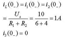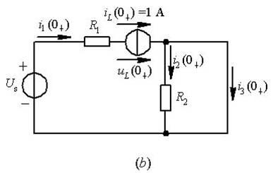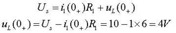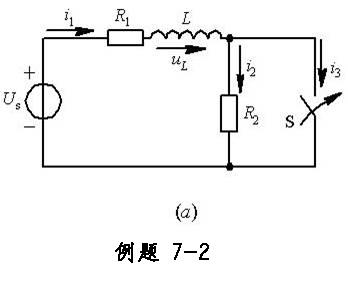 如图7-2(a)所示电路, 已知Us=10V, R1=6Ω, R2=4Ω, L=2mH, 开关S原处于断开状态。求开关S闭合后t=0+时, 各电流及电感电压uL的数值。