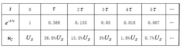 τ=RC的大小决定过渡过程的进展速度,τ越大,过渡过程越慢。下表给出了电压与时间和时间常数之间的一些特殊数值。