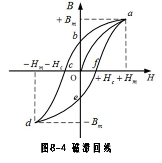 当H开始从零逐渐增大时,B也随着增大,最后H增大到Hm时,B达到饱和值+Bm,得到了起始磁化曲线oa。此后,逐渐减小H,B也随之减小,但B滞后于H的变化,沿着上方的曲线ab下降。当H减小到-Hc时,B变为0。当H继续减小时,铁磁物质开始反向磁化,当H减小到-Hm时,反响磁化达到饱和状态-Bm,当H由-Hm回到0时,磁感应强度沿变化完成了一次循环。磁滞回线的形状与铁芯的铁磁物质有关。