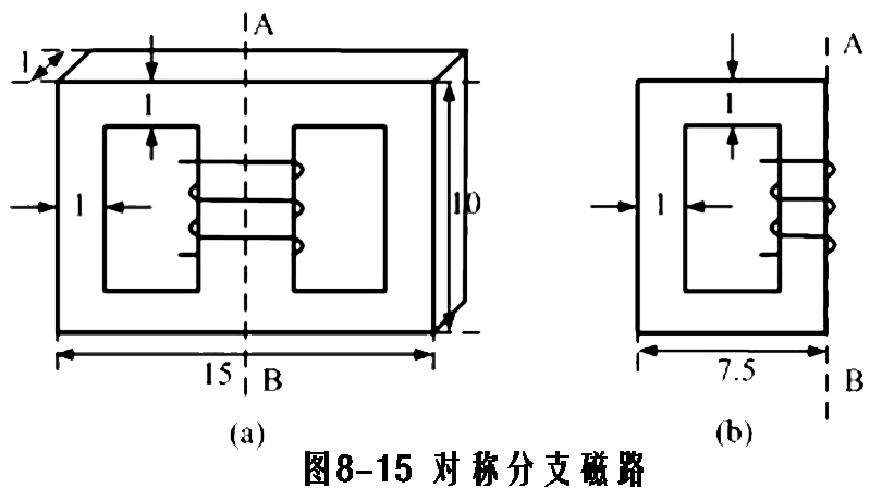 对称分支磁路就是磁路存在着对称轴,轴两侧磁路的几何形状完全对称,相应部分的材料也相同,两侧作用的磁通势也是对称的,如图8-15所示的轴。