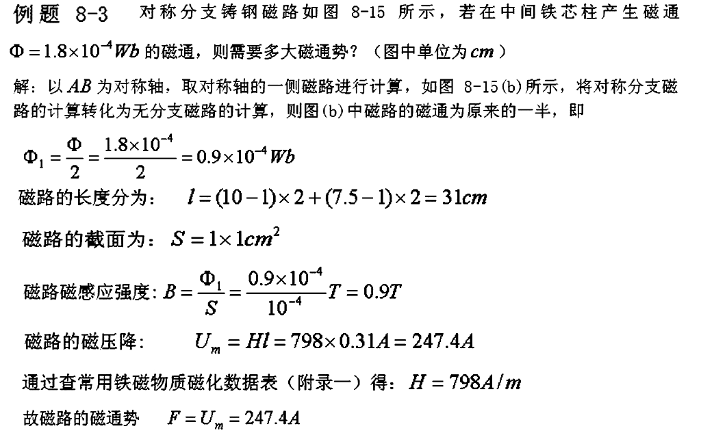 根据磁路定律,这种磁路的磁通分布也是对称的。因此,当已知对称分支磁路的磁通求磁通势时,只要取对称轴的一侧磁路计算即可求出整个磁路所需的磁通势。取对称轴一侧磁路计算时,中间铁芯柱(对称轴)的面积为原铁芯柱的一半,中间柱(对称轴)的磁通也减为原来的一半。但磁感应强度和磁通势却保持不变。这种磁路的计算也有两类问题:一类是已知磁通求磁通势;另一类是已知磁通势求磁通。具体的计算步骤及方法同无分支磁路。