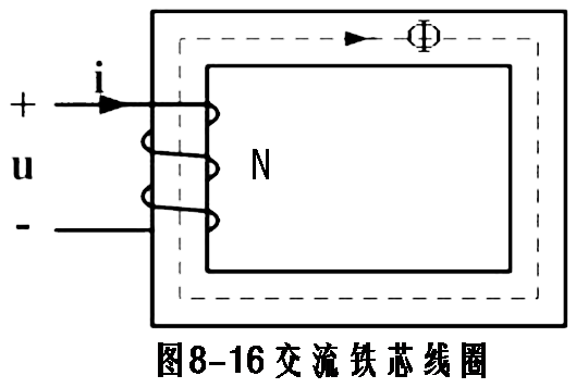 交流铁芯线圈如图8-16所示,线圈两端加一交流电压,则线圈中的电流将产生磁通,方向符合右手螺旋法则。