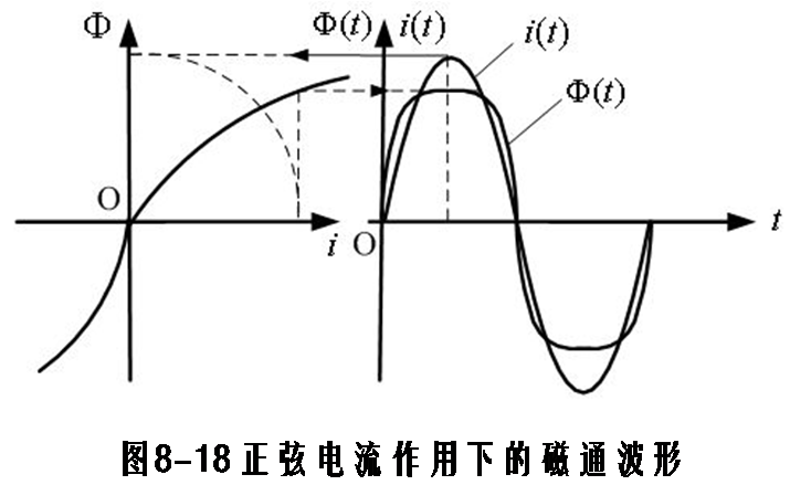 当电压为正弦波时,磁通也为正弦波,但电流却是具有尖顶的非正弦波,这种波形畸变是由于磁饱和所造成的。电压越高,磁通越大,铁芯饱和越严重,则电流波形畸变后变得更尖。若电压与磁通的振幅都较小,铁芯没有饱和,则电流波形将更接近正弦波。当电流作正弦变化且工作至饱和区域时,磁通具有平顶波形,如图8-18所示 。