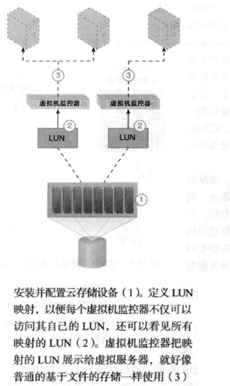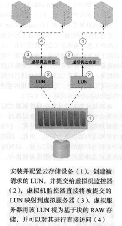 存储LUN常常通过主机总线适配器(HBA)映射到虚拟机监控器中,其存储空间仿真为虚拟服务器上基于文件的存储。