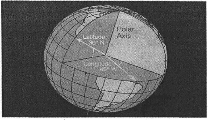 Figure 3 Measurement of latitude and longitude relative to the equatorand the Prime Meridian and the Earth's rotational or polar axis