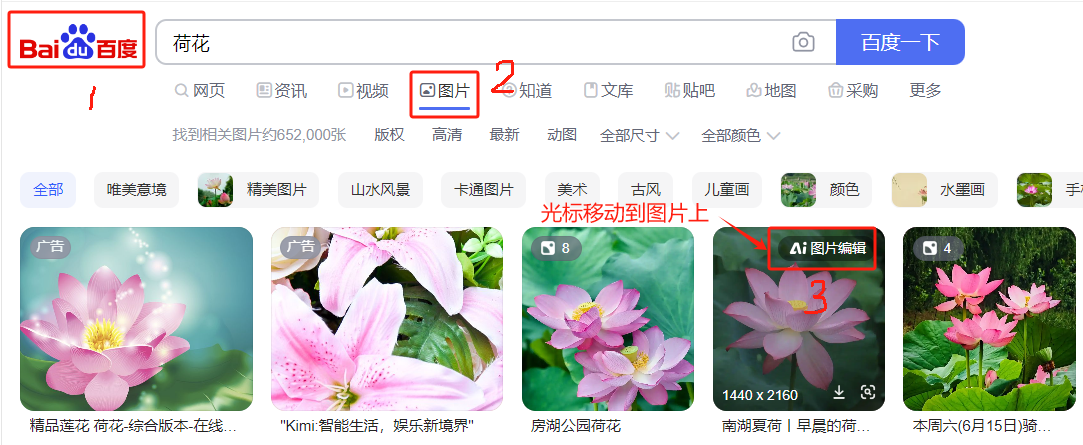 进入方法:可以百度搜索"百度AI图片助手",也可以从百度里随意搜一张图,点击图片上的"AI 图片编辑":