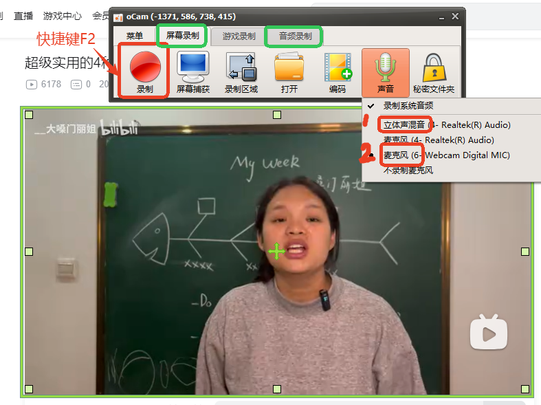 如果是录制屏幕需要调整录制范围(下图绿色框框),按下F2或红色按钮开始录制。在桌面找到录制文件。