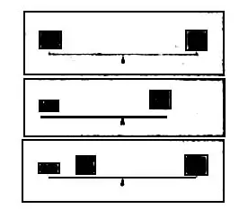 例如,画面A原本是均衡的,但施加深浅色调后,右侧深色色块会使画面重心偏右 (图B)。 可以通过将物体略微向左移动 (图C)、提高右侧物体明度或降低左侧物体明度 (图D)、或改变物体形体 (图E) 等方法来重新达到均衡。