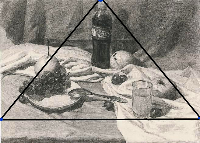 1. 构图形式: 不同的构图形式为画面提供了不同的视觉引导和结构基础。 在静物素描中,常见的构图形式有: