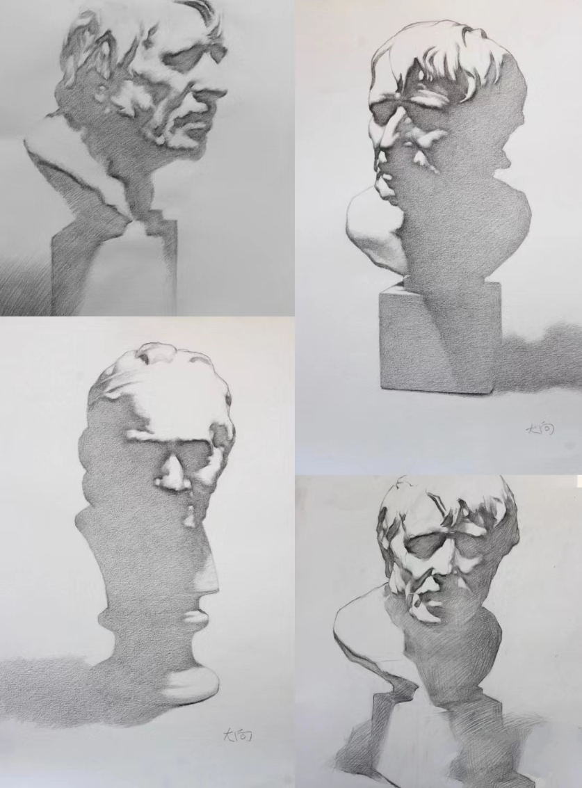 面对复杂的石膏像明暗变化,要学会进行调子的概括与归纳。调子的概括与归纳是指将复杂的明暗层次简化为几个主要的调子,突出画面的整体性和概括性。