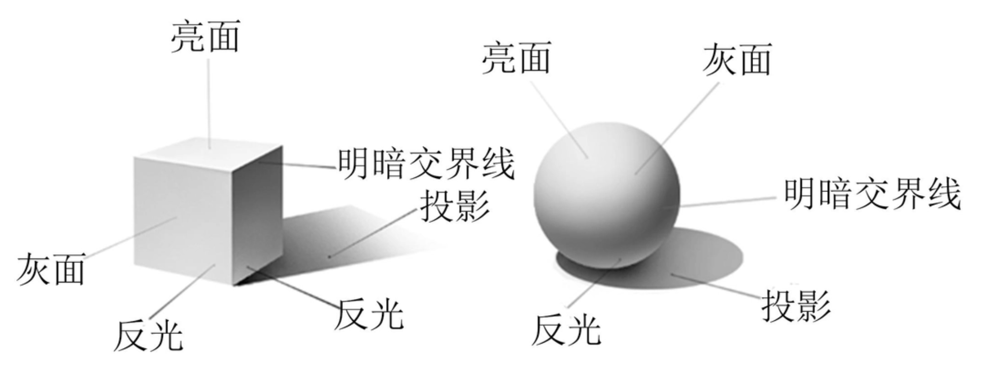 亮灰((亮)灰面):亮面中略微偏灰的区域,是物体受光面主要的明暗层次。