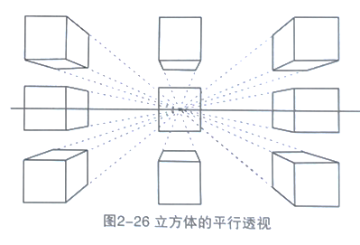 平行透视 (一点透视): 物体的上下两个面与地面平行,一个面与画面平行,观者能够看到这个面的真实形状时,所产生的透视现象。立方体平行透视只有一个消失点,即心点。